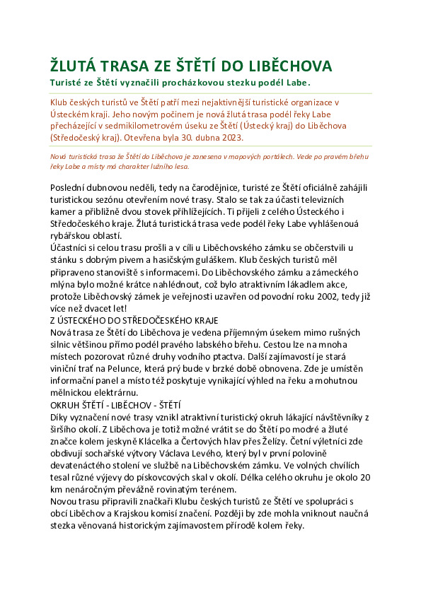 Ve Štětí působí jeden z nejaktivnějších Klubů českých turistů v Ústeckém kraji, který má zásadní podíl na rozvoji turistických tras v okolí. Nedávno například vyznačil novou žlutou trasu podél řeky Labe ze Štětí do Liběchova. Známá je naučná stezka loupežníka Štětky, která má 21 naučných stanovišť na cca 30 kilometrech. Právě KČT Štětí převezme v roce 2025 pořadatelskou štafetu od kolegů z Hlučína na Ostravsku, aby v následujícím roce (2026) zajistil konání 54. ročníku akce Za posledním puchýřem. A máme se na co těšit.
